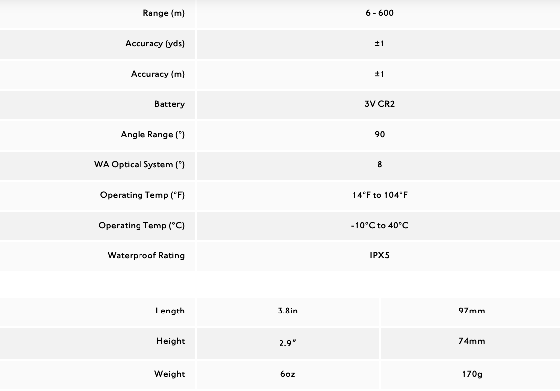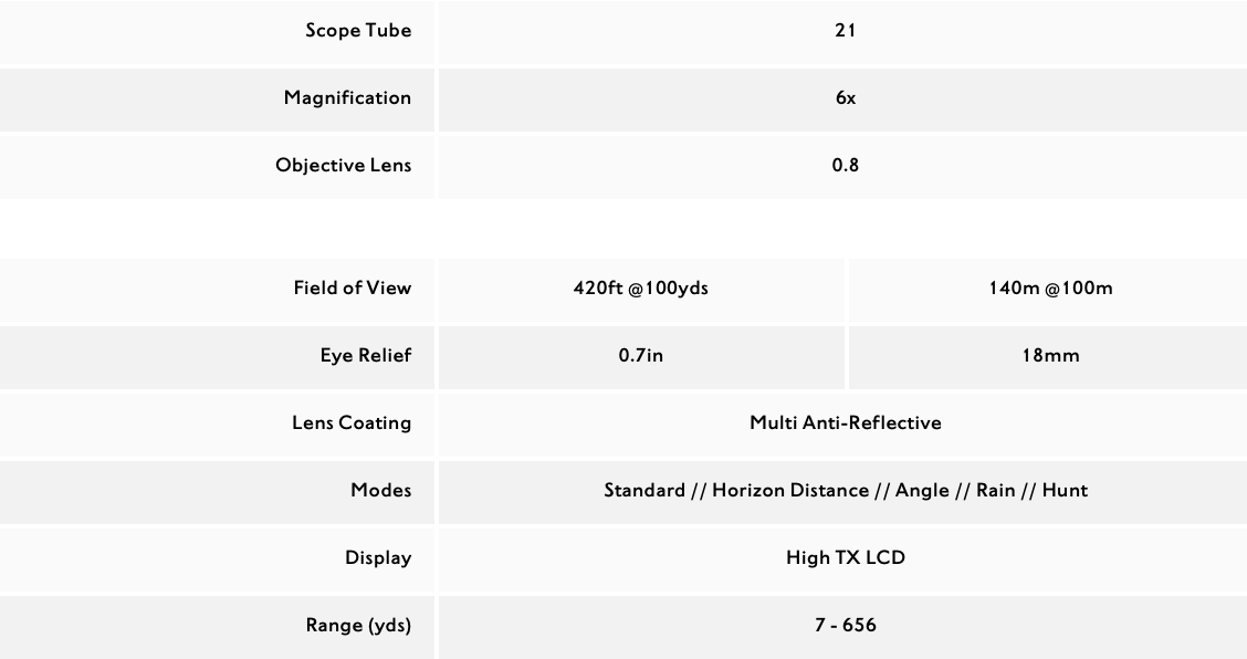 Its range finding capabilities include: Distance (inc. continuous scan mode), Rain, Hunt, Horizontal Distance and Angle modes.