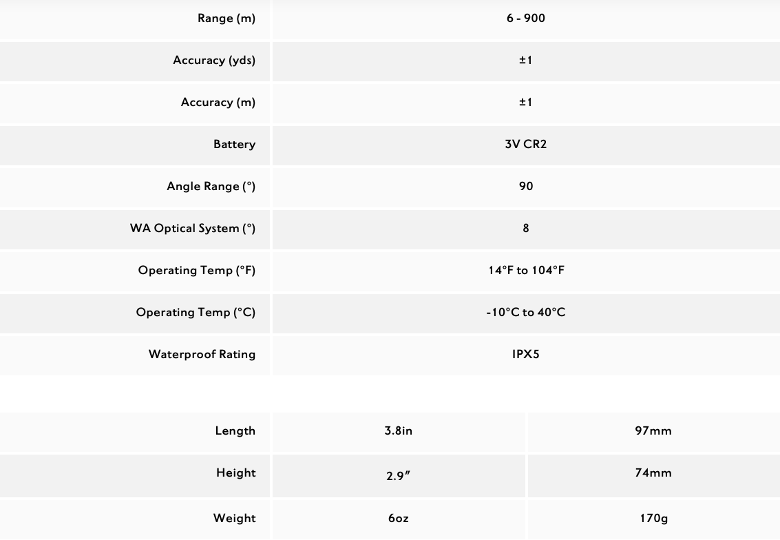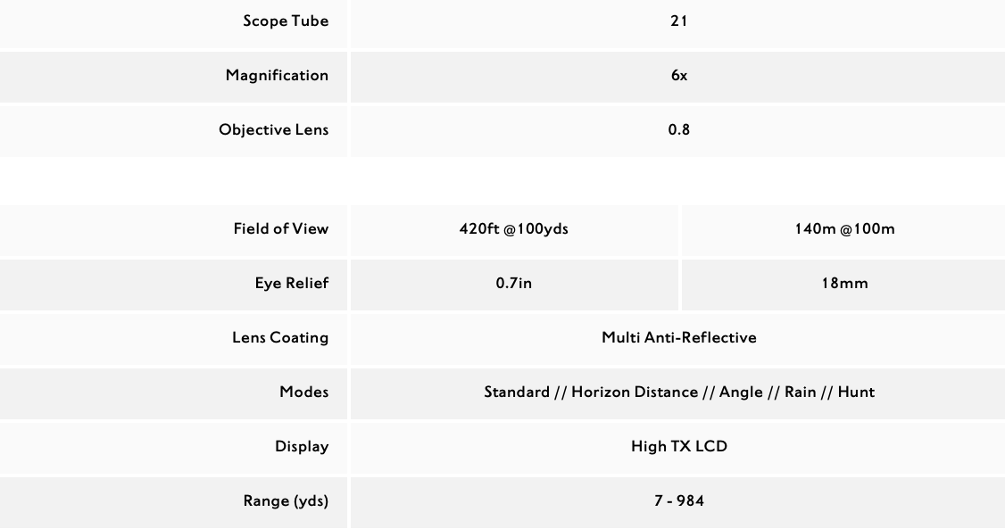 Its range finding capabilities include: Distance (inc. continuous scan mode), Rain, Hunt, Horizontal Distance and Angle modes.