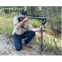 The Hyper Pod 3 is designed to allow for mobile hunting and the ability to shoot accurately with fast set up time. When deployed it allows a shooter to get in position and shoot within seconds. It also allows carriage while walking around ether on the firearm or in hand when detached. The shooter can shoot standing with Hyper Pod 3 tucked into the hip, kneeling with the Hyper Pod 3 on the ground, or sitting with Hyper Pod 3 on the ground.