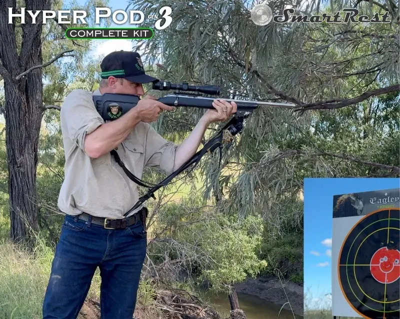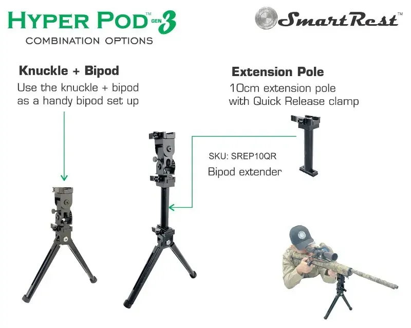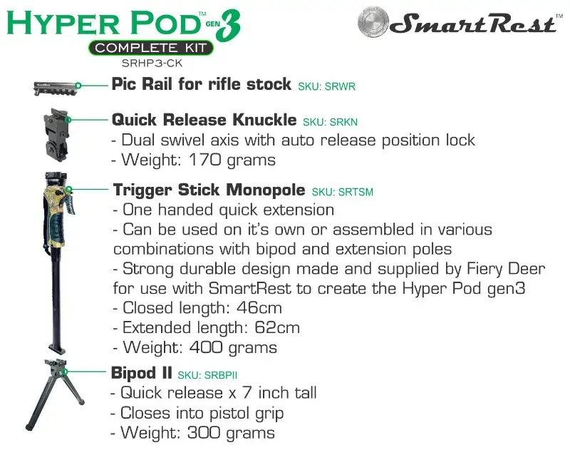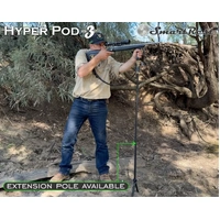 The Hyper Pod 3 complete kit is a monopod trigger pole, with a quick release knuckle attachment which attaches to the pic rail on the fore end of a rifle stock and a bipod on the base.