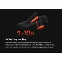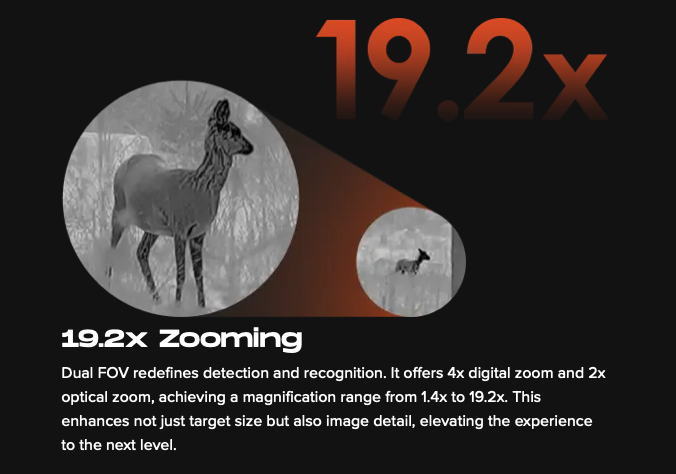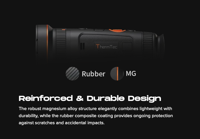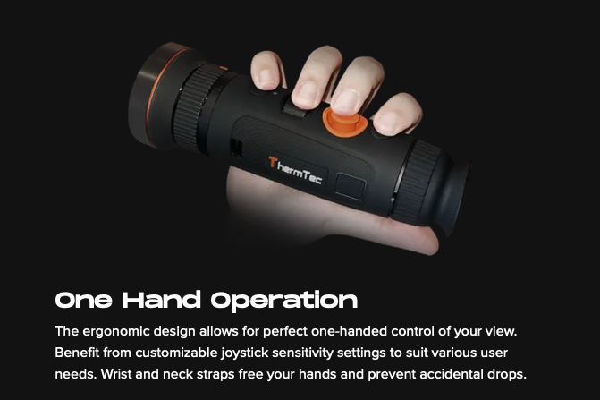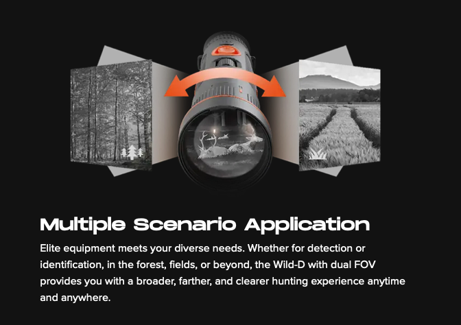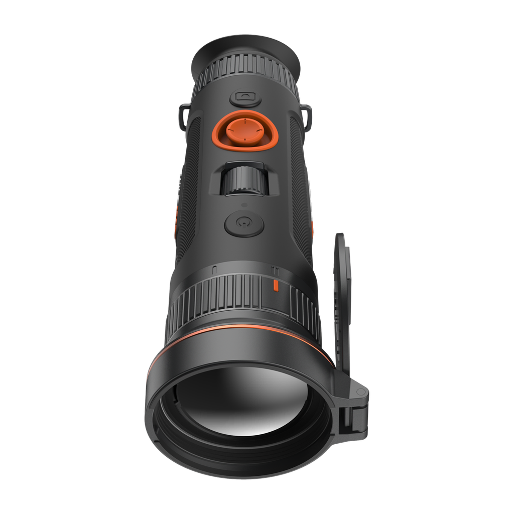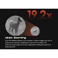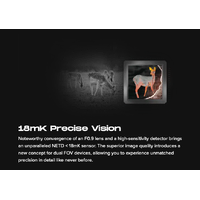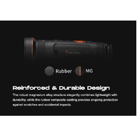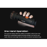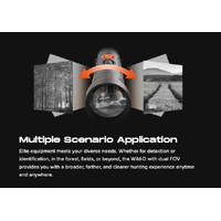 The Thermtec Wild-D Series thermal imaging monocular offers unmatched precision with a highly sensitive NETD < 18mK sensor and F0.9 lens, delivering exceptional image clarity in diverse environments. Designed for versatility, its dual field-of-view (FOV) system and 19.2x zoom (4x digital and 2x optical) enhance detection and recognition across forests, fields, and beyond. Boasting an industry-leading 20-hour battery life across two rechargeable batteries, the Wild-D ensures you never miss a moment. It features a rapid 3-second startup, ergonomic one-handed operation, and customizable joystick settings for seamless control. Advanced AI and algorithms provide ultra-long image stability for up to an hour without recalibration, while the magnesium alloy structure and rubber coating ensure durability. Additional features include a silent lens cover, six color palettes, 64GB built-in memory, IP67 waterproof rating, and a crisp 0.39-inch AMOLED display, making it ideal for any hunting scenario.