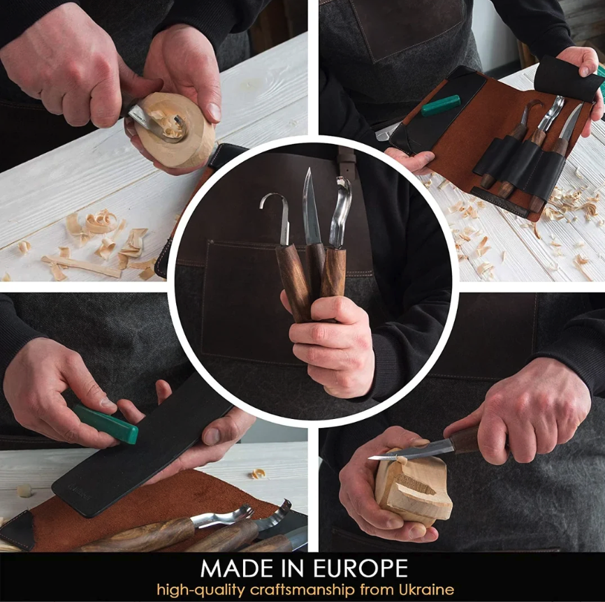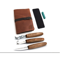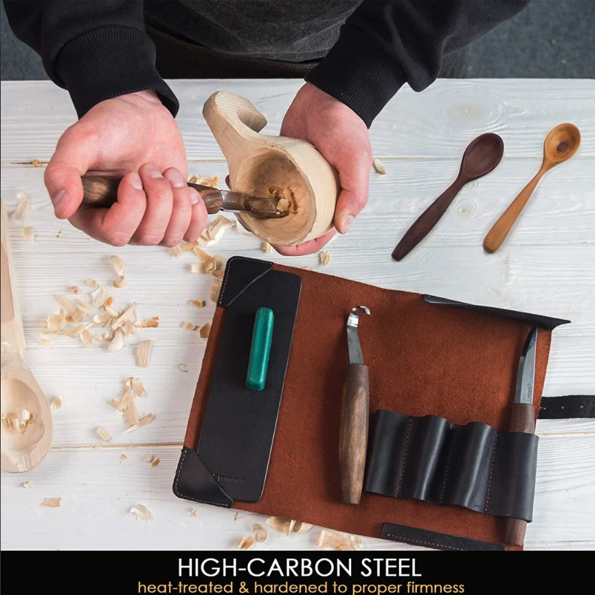 Spoon Carving Set with Gouge (SK5RX + K8a/14 + C1X + honing acc) in Genuine Leather Roll
